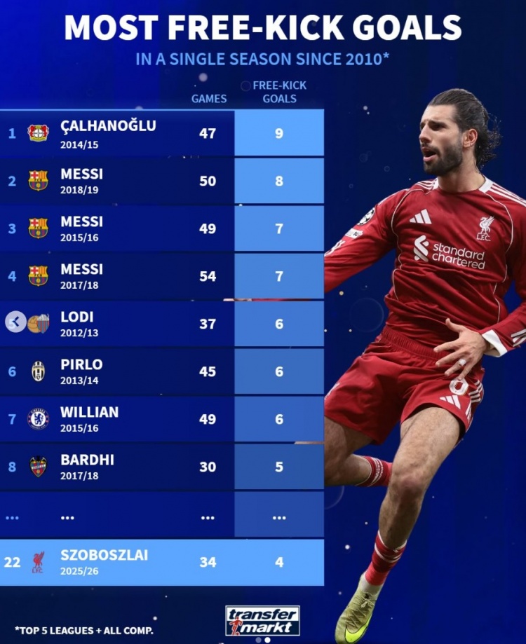 在最近的英超较量中,利物浦战队以1-2的比分被曼城逆转,令人唏嘘。尽管球队未能带走胜利,但索博斯洛伊展现了过人的技术,通过一个精妙的直接任意球,为球队打入了一个精彩的进球,这也是他在本赛季的第四个任意球进账。根据数据统计,索博斯洛伊已经跻身2010年后五大联赛球员单赛季任意球进球榜的第22位,进一步印证了他的踢球能力。