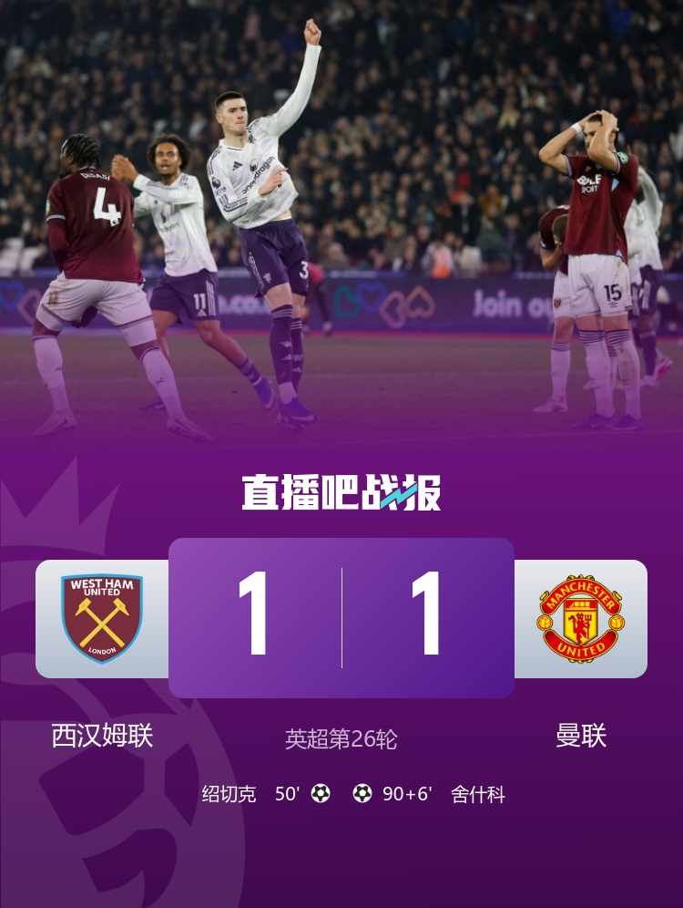 曼联错失五连胜机会 西汉姆联在英超战平归来舍什科终场前惊艳救主_英超直播
