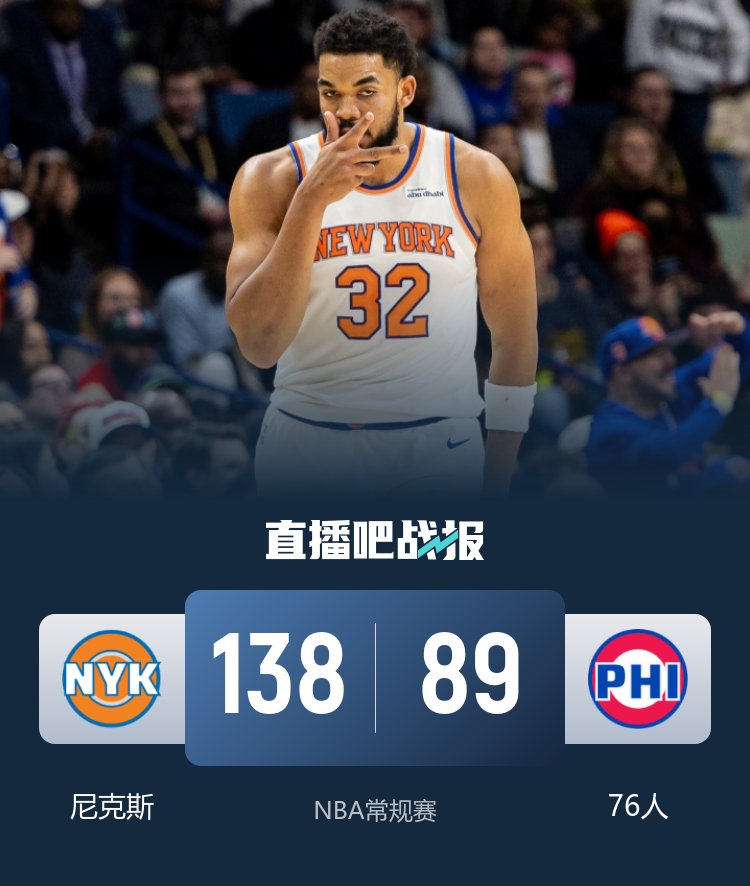 尼克斯以49分的巨大优势战胜76人 唐斯贡献21分11篮板5助攻 老六命中8记三分 马克西砍下32分_NBA直播
