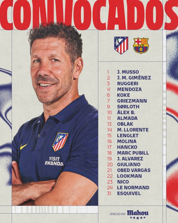 马竞国王杯对阵巴萨大名单包括卢克曼 阿尔瓦雷斯 和格列兹曼_西甲直播