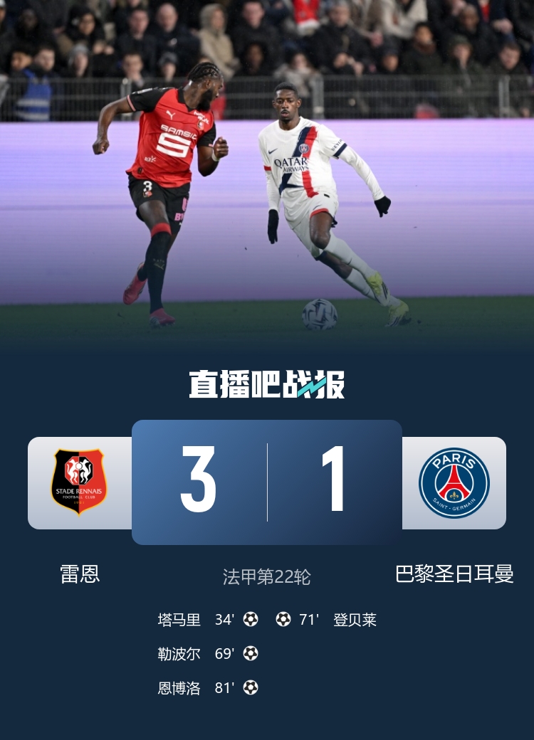 巴黎连胜之路被雷恩阻断 先赛暂时领先两分 杜埃错失良机登贝莱挺身而出_法甲直播