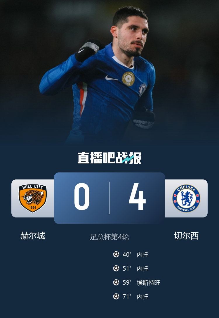 切尔西以4比0战胜赫尔城晋级足总杯16强 内托上演帽子戏法 德拉普提供三次助攻_足总杯直播