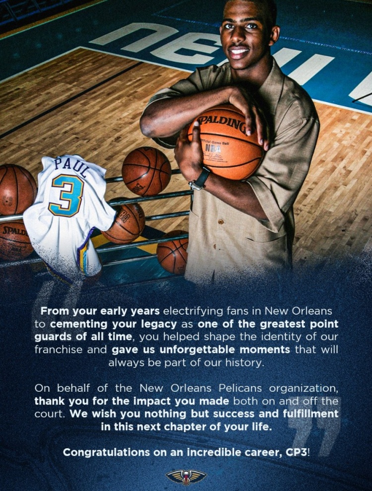 新奥尔良鹈鹕俱乐部对此发表了声明,向保罗表达祝贺,内容如下: