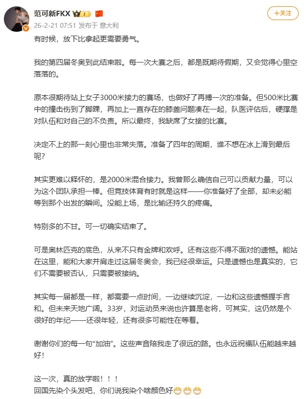 范可新在社交媒体上发文:奥林匹克不仅仅是金牌和欢呼,还有无法回避的遗憾_冬奥会直播