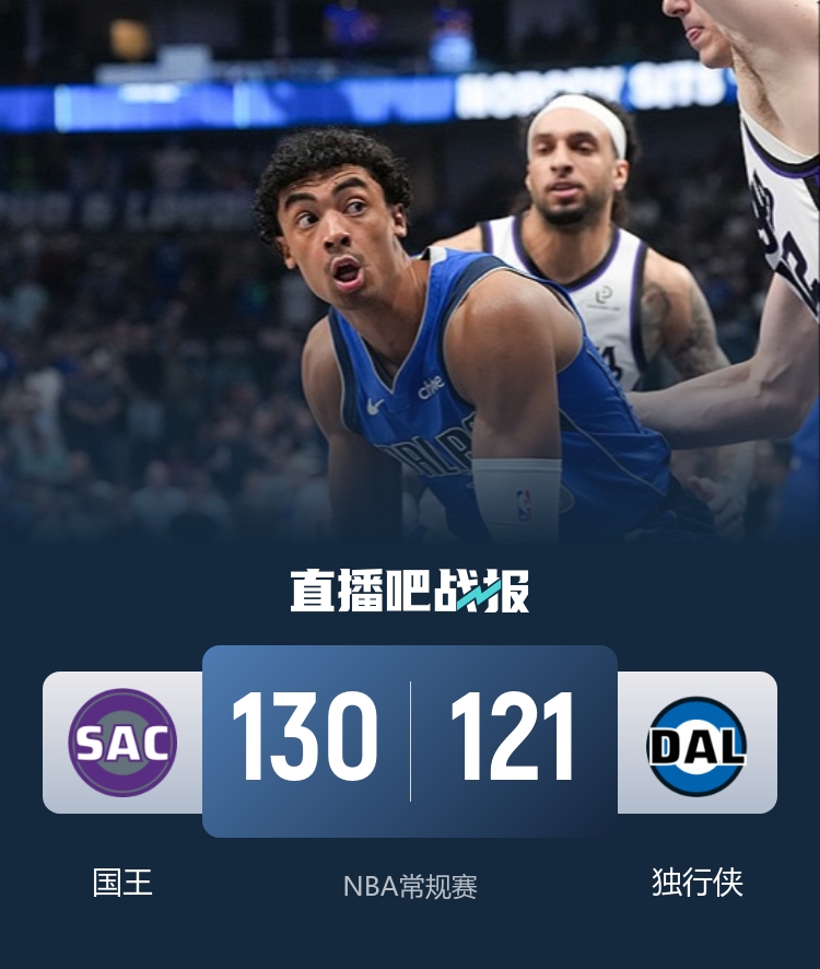 进入下半场,国王在进攻端出现低迷,独行侠趁机打出11-0的攻击波,将分差缩小至3分。但国王迅速调整,打出14-2的反击再度稳住局势,巴格利在此过程中撞到头暂时回更衣室。第三节,两队势均力敌,以32平结束。最后一节,独行侠在努力追赶,再次打出12-0的高潮,将差距缩小至个位数,随后他们又将分差缩小至3分。在比赛关键时刻,普洛登的暴扣加罚球为国王锁定胜局,最终国王以130比121力克独行侠。
