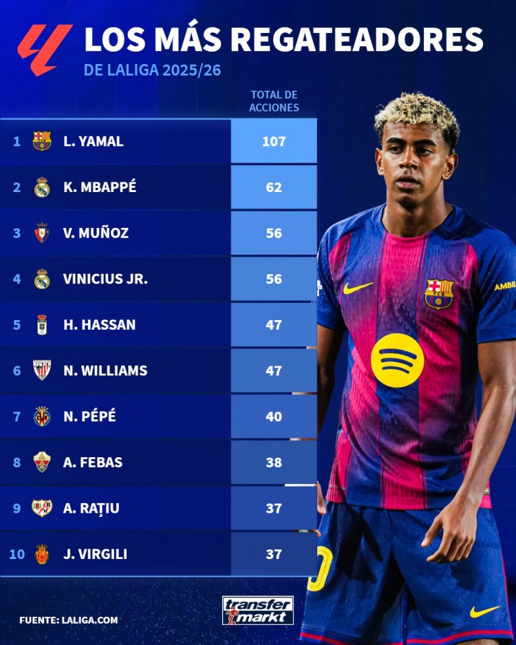 在这个越来越看重高强度防守的时代,巴萨的年轻天才亚马尔简直就是一枚超级武器。他那如同魔术般的盘带技巧,使得对手的密集防线简直形同虚设。根据西甲官方公布的数据,亚马尔在2025/26赛季以107次的惊人过人次数高居排行榜的第一位,真是傲视群雄。