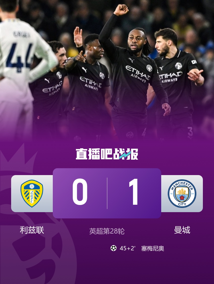 曼城以1比0战胜利兹联取得联赛四连胜,距离榜首仅差2分,塞梅尼奥打入制胜球,勒温错失单刀机会_英超直播