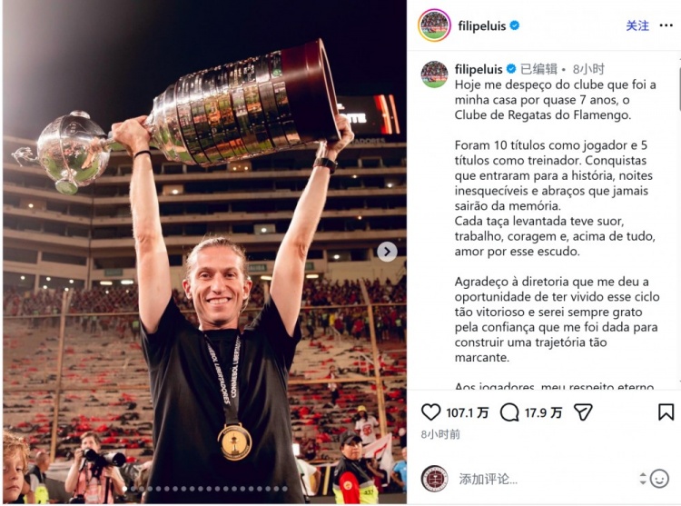 弗拉门戈俱乐部近日官方宣布,主帅费利佩·路易斯将离职。费利佩·路易斯在社交媒体上发表离别感言,表达了他对这家俱乐部的深厚情感。他提到,自己在弗拉门戈度过了七年时光,将其视作家一般,期间作为球员赢得了10座奖杯,而作为教练则夺得了5个冠军,这些成就都镌刻在历史中。