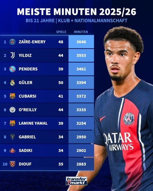3月13日讯 根据德转的统计,本赛季五大联赛U21球员的出场时间榜单已出炉,其中来自巴黎圣日耳曼的埃梅里以3646分钟名列第一。紧随其后的是尤文图斯的伊尔迪兹,他的出场时间达到了3553分钟,而巴萨的年轻小将亚马尔则排名第七,出场时间为3254分钟。