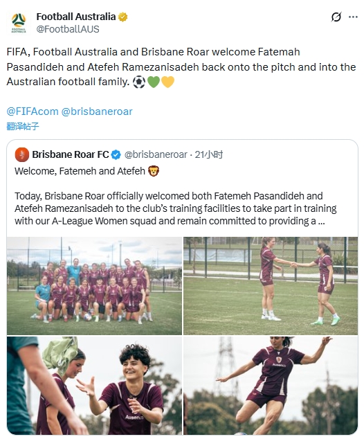 3月17日,澳大利亚足协通过社交媒体发布公告,欢迎两位伊朗女足球员在澳大利亚继续踢球。目前她们正在与布里斯班狮吼女足进行训练。