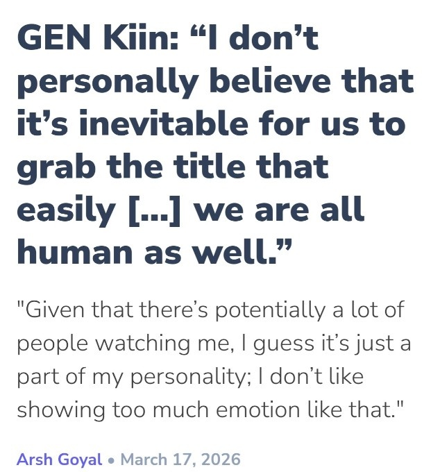 他总结道,这种认可不仅是对他个人技术的肯定,更是对他不断努力的回报。随着比赛的进程,Kiin希望能继续保持这样的积极状态,努力为团队争取更好的成绩。