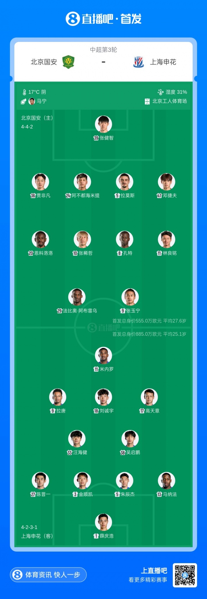 国安申花大战来袭 外援对抗上演四对三 19岁小将邓捷夫和吴启鹏登场 塞鸟无法参战_中超直播