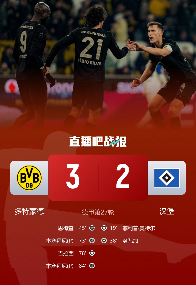 多特逆转汉堡收获胜利 落后拜仁9分 本塞拜尼点球双响 吉拉西破门_德甲直播