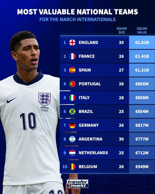 三月国足身价排行榜英格兰高居榜首法国紧随其后不愧是金字塔尖的游戏_体育直播