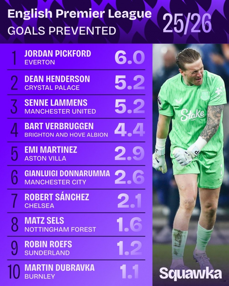 本賽季英超門將阻止進球排行榜:皮克福德以6球領跑,拉門斯緊隨其後達到5.2球
