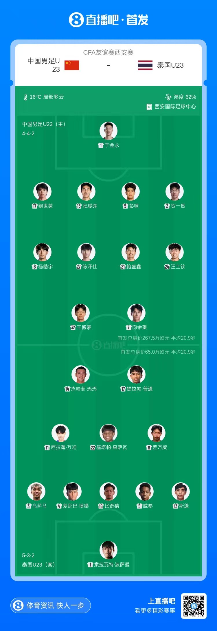 国足U23对阵泰国U23首发阵容揭晓:余望领衔陈泽仕汪士钦于金永先发_体育直播