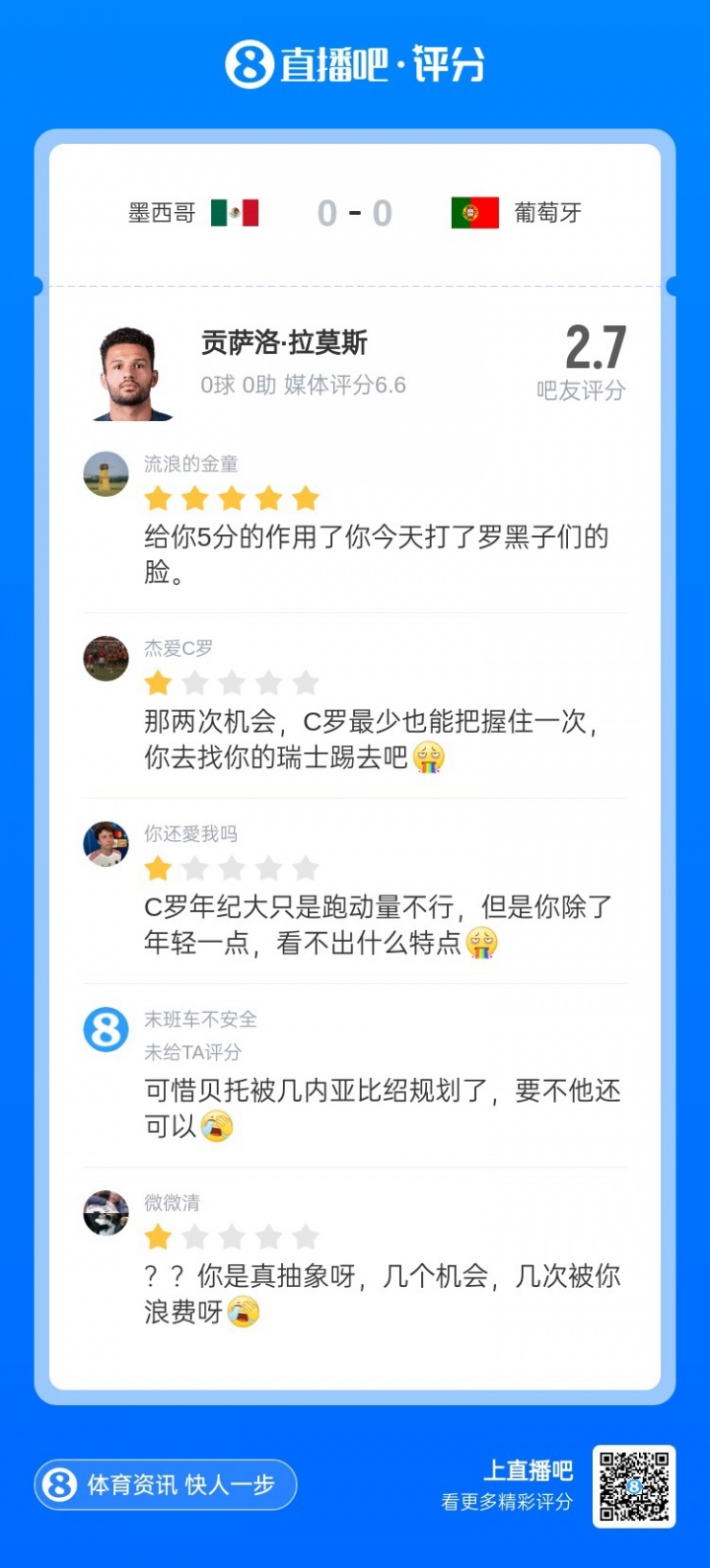 在社交媒体上,网友们纷纷发表看法,给予拉莫斯的表现评分低得让人心寒。许多支持者尤其关心葡萄牙队未来的锋线发展,希望能够看到更具活力和战斗欲望的年轻球员崭露头角。显然,此役的平局虽然没有直接影响球队的排名,但球迷们对拉莫斯的未来和对球队的期待已经引起了广泛的关注及争议。