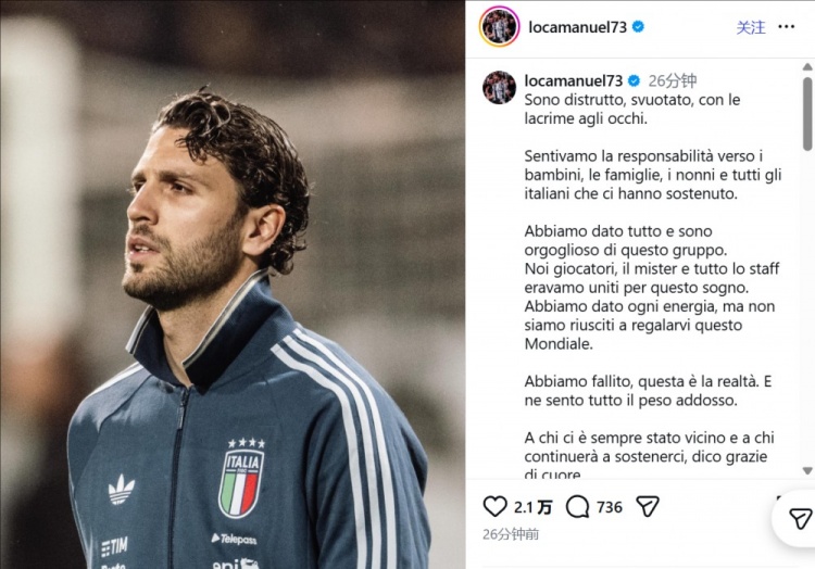 洛卡特利在社交媒体上发声:我深感失落,未能将这届世界杯献给大家_意甲直播