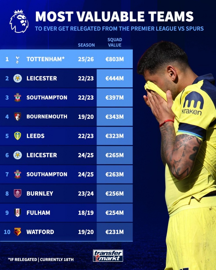 若热刺降级将创造英超降级球队最高身价纪录达到8.03亿欧元_英超直播